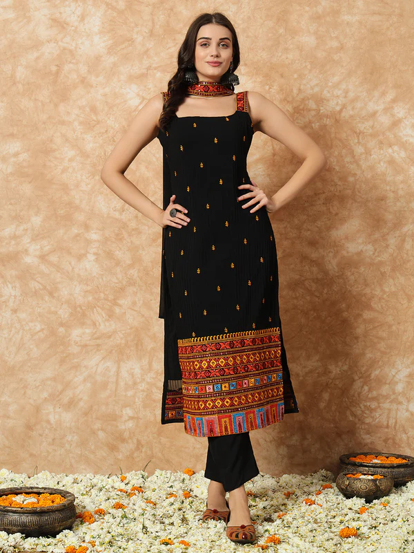 “Loving my new Georgette Embroidery Straight Black Kurta Set!  The intricate embroidery details and flowy fabric make me feel like a queen  Plus, it’s perfect for any occasion – from a casual day out to a fancy event.  Who else is obsessed with this elegant and versatile piece?